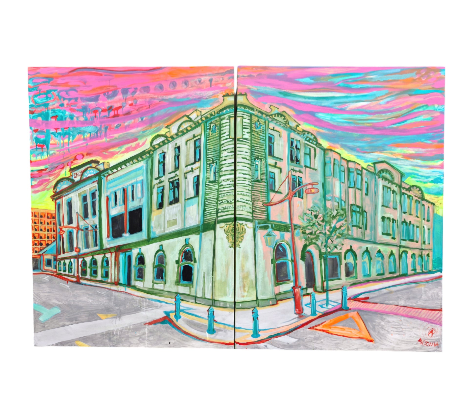 The Grand Grosvenor Hotel is a diptych painting created during one of ART STUDIO's live performance painting sessions. 10 hours of solid painting work depicting an impressionist representation of the Grosvenor Hotel. Drawing influence from Robert Delaunay's 'Eiffel Tower' series. No rulers were used and the sketch was created free hand to create a more fluid depiction of the building. The colours selected were mixed and used in improvisation to give a jazz expressionist feeling to the painting.